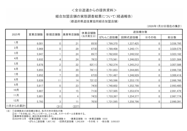 【パチンコ ニュース】組合加盟店舗実態調査(2025.12月末時点)が公表されています